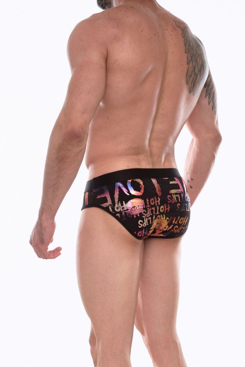 Черные трусы-брифы с блестящим принтом в виде надписей и губ.