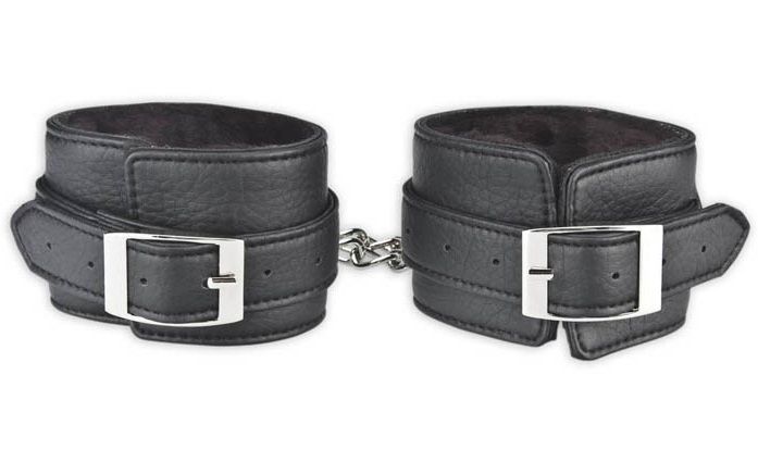 Черные фиксаторы для ног из искусственной кожи с мягким черным мехом внутри для большего комфорта при сковывании Вашего партнера. Между собой браслеты соединяются металлической цепью с крупными звеньями, застегиваются на замок с ключами (есть в комплекте). One size.