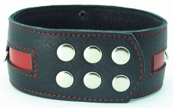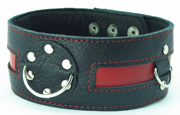 Чёрный кожаный ошейник с красной полосой и кольцами