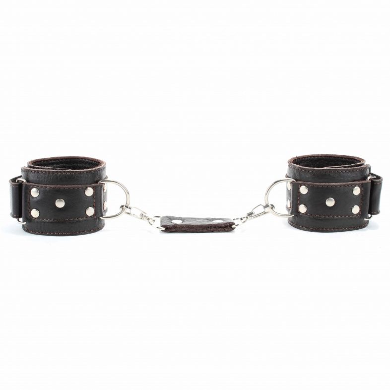 Кожаные наручники потрясающего коричневого цвета.Украшены заклепками и соединяются между собой цепью с карабинами. Размер наручников регулируется при помощи застежки-липучки Ширина - 5 см.