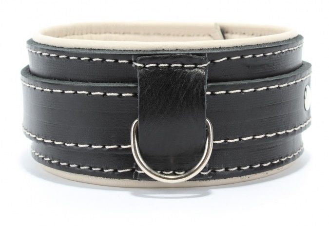 Ошейник с бежевым подкладом. Выполнен из толстой ременной кожи черного цвета, подклад мягкая перчаточная кожа светло бежевого цвета. На пряжке. Использована усиленная металлическая фурнитура. Строчка толстой ниткой контрастного светлого цвета.